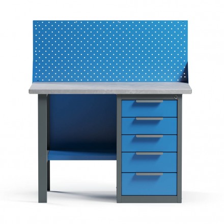 - Верстак укомплектован драйвером с пятью выдвижными ящиками разными по высоте и тумбой с полками.