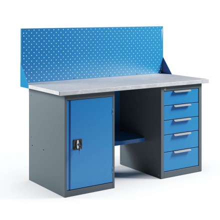 Верстаки имеют надежную модульную конструкцию с усиленной столешницей (плита МДФ 25 мм, покрытая листом оцинкованного металла). Дополнительно верстаки всех серий можно укомплектовать инструментальной панелью (экраном и навесными элементами для хранения инструмента).