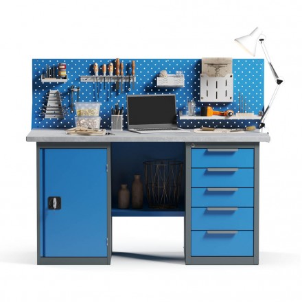 - Верстак укомплектован драйвером с пятью выдвижными ящиками разными по высоте и тумбой с полками.