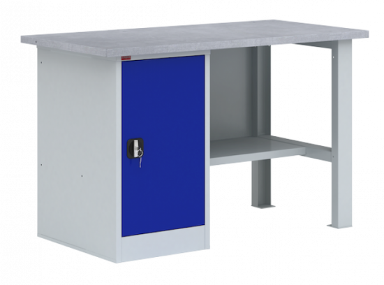 Верстак состоит из отдельных модулей: – столешница из МДФ, покрытая оцинкованным листовым металлом (нагрузка 300 кг); – стенка задняя - металлическая; – металлическая верстачная опора; – тумба с 2-мя съемными полками (нагрузка 30 кг) и дверью, запирающейся замком; – полка верстачная, нагрузка до 40 кг