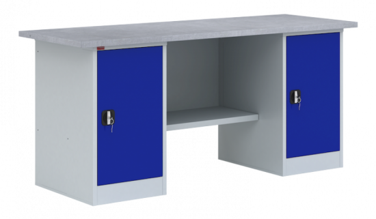 Верстак состоит из отдельных модулей: – столешница из МДФ, покрытая оцинкованным листовым металлом (нагрузка 300 кг); – стенка задняя - металлическая; – две тумбы с 2-мя съемными полками (нагрузка 30 кг) и дверью, запирающейся замком; – полка верстачная, нагрузка до 40 кг