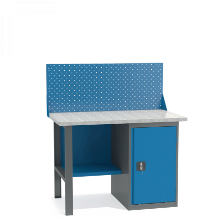 Верстаки имеют надежную модульную конструкцию с усиленной столешницей (плита МДФ 25 мм, покрытая листом оцинкованного металла). Дополнительно верстаки всех серий можно укомплектовать инструментальной панелью (экраном и навесными элементами для хранения инструмента).